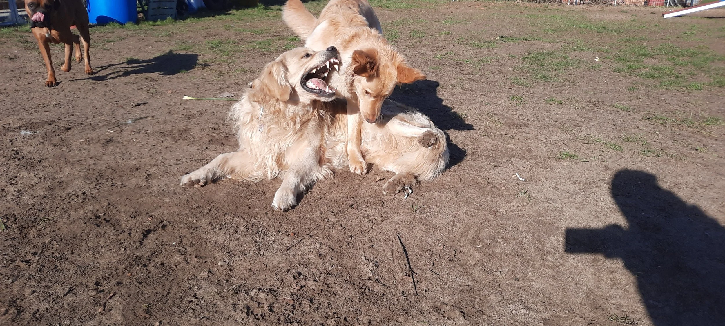 2. In der Sozialkontaktstunde lassen wir - unter Anleitung! - auch Sozialkontakte zu, die nicht immer komplett harmonisch sind. Konflikte gehören zum Miteinander dazu. Ebenso stellt Aggression einen wichtigen Anteil des hündischen Ausdrucksverhalten dar und kann durchaus auch konstruktiv sein. Hunde kommunizieren dabei auch über den Fang - und ggf. mit den Zähnen. Safety first!